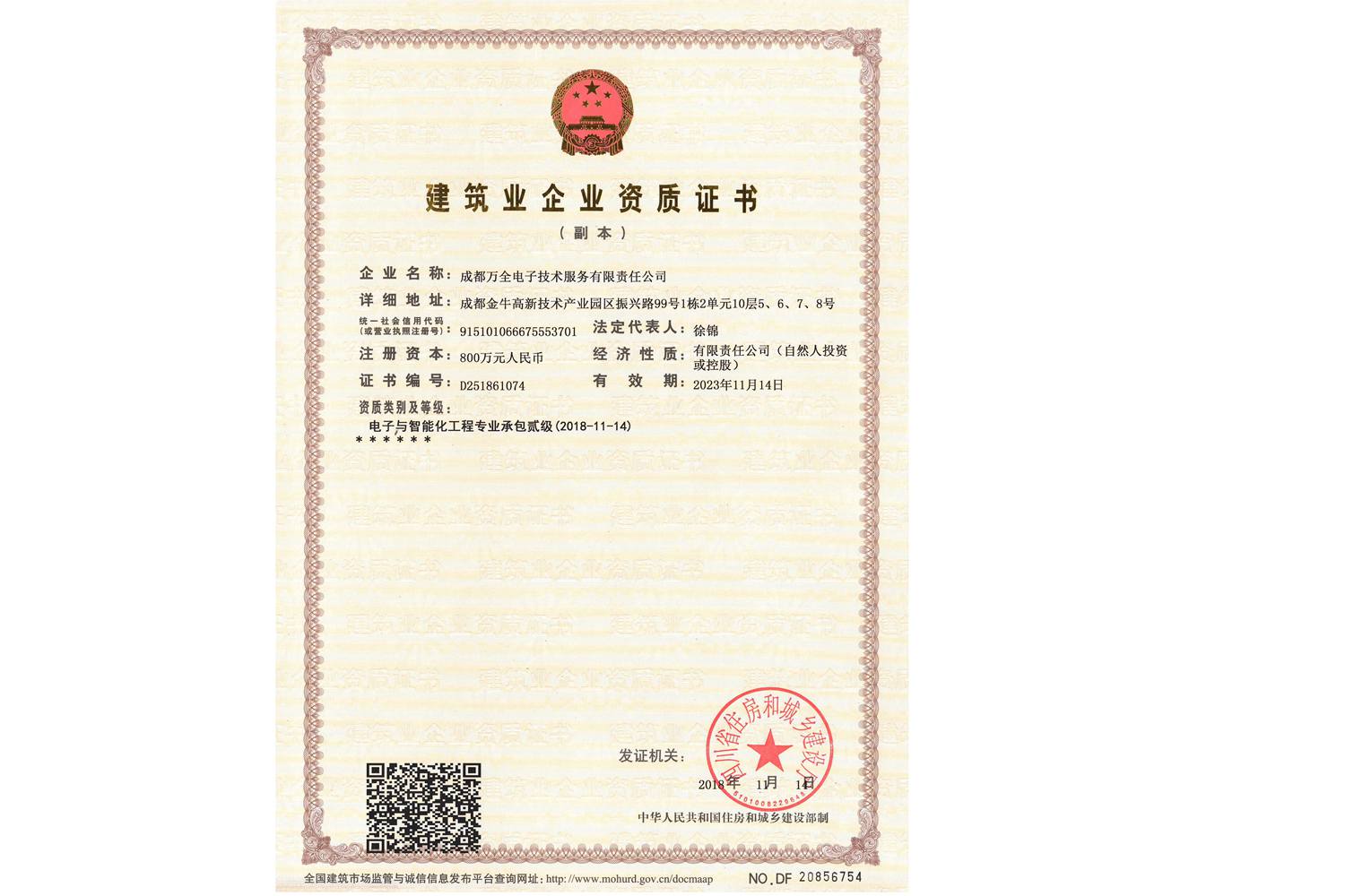 2018年11月安防工程公司成都萬全電子取得《電子與智能化工程專業承包貳級》資質